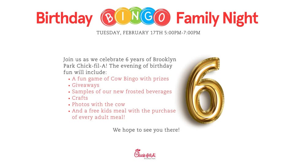 Join us and help celebrate 6 years of Brooklyn Park Chick-fil-A! We’ll have a night of birthday fun with: